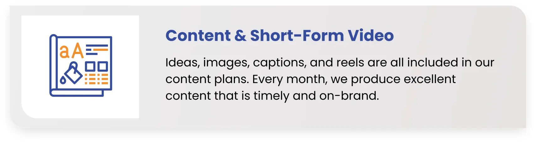 We make everything. The plan, the visuals, the copy, and the videos. We can only  ask you for something if we need footage, or photos specific to your business that we can’t produce ourselves, and we’ll tell you that clearly at the start, not halfway through the month.